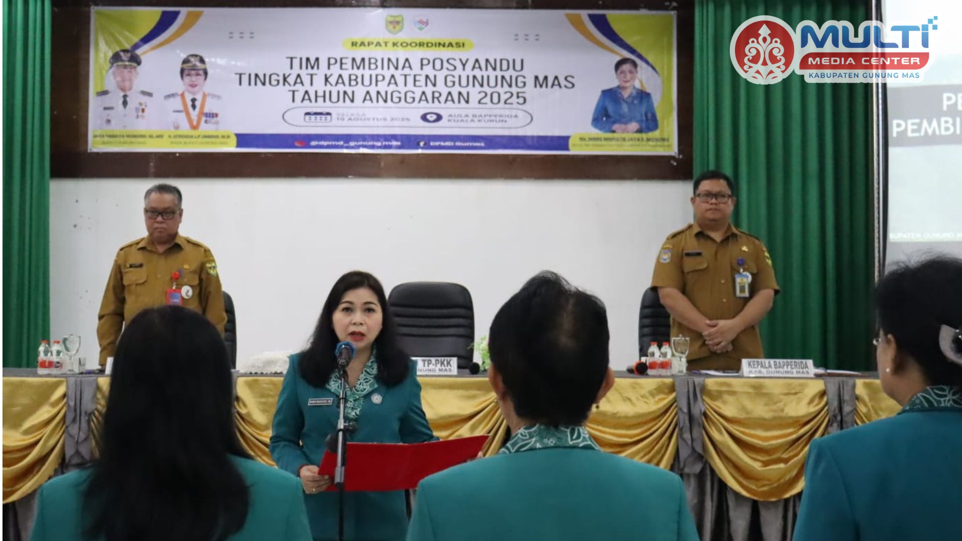 MMCGumas – Kuala Kurun – Ketua TP-PKK, selaku Ketua Tim Pembina Posyandu Kabupaten Gunung Mas, Mimie Mariatie Jaya S. Monong, secara resmi mengukuhkan Ketua Tim Pembina Posyandu dari 12 kecamatan se-Kabupaten Gunung Mas. Pengukuhan tersebut berlangsung di Aula Bapperida, Selasa (19/8/2025).