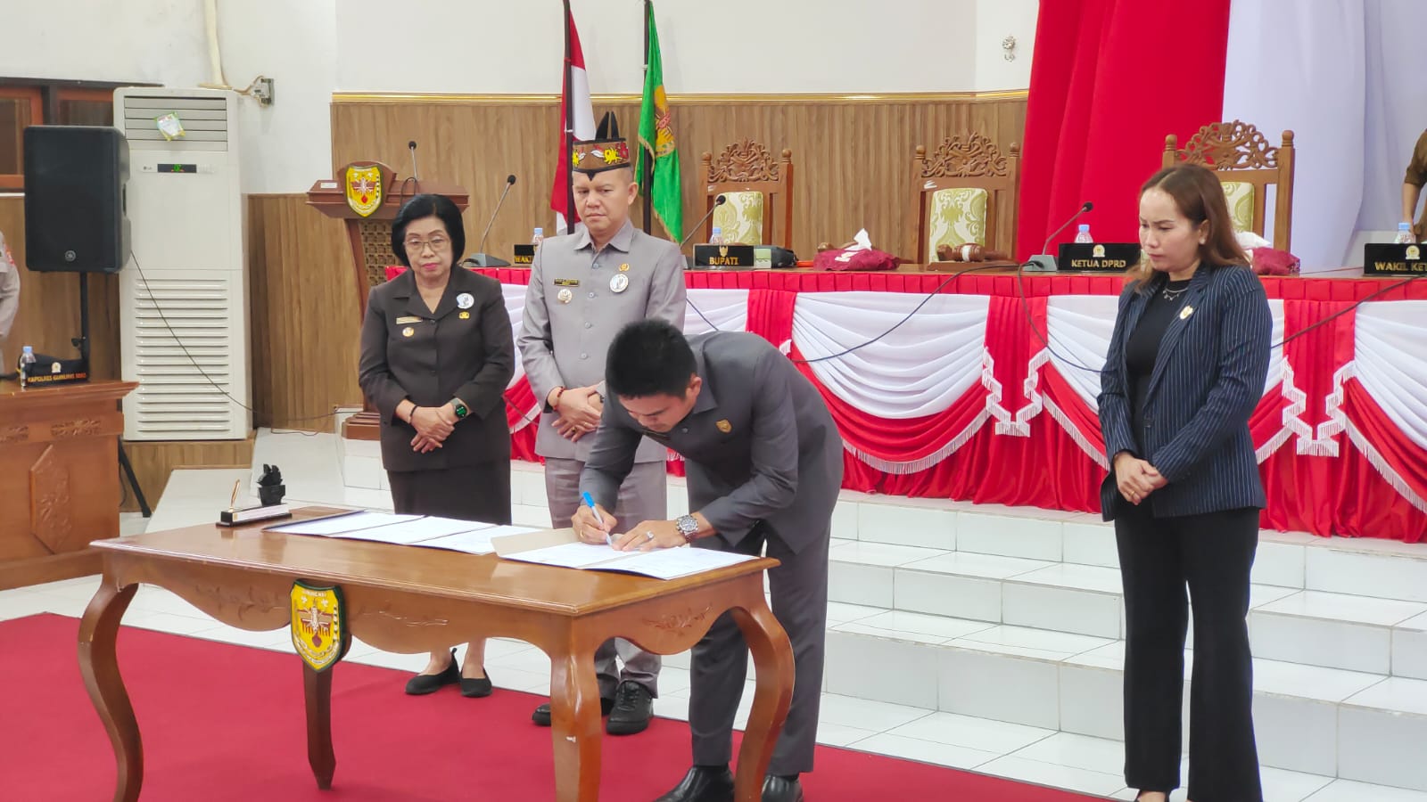 MMCGumas – Kuala Kurun – Bupati Gunung Mas, Jaya Samaya Monong, bersama Wakil Bupati, Efrensia L.P. Umbing, menyaksikan langsung penandatanganan dokumen Rencana Kerja (Renja) DPRD Kabupaten Gunung Mas Tahun 2026 dalam Rapat Paripurna ke-5 Masa Persidangan I Tahun Sidang 2025, Senin (29/9/2025).