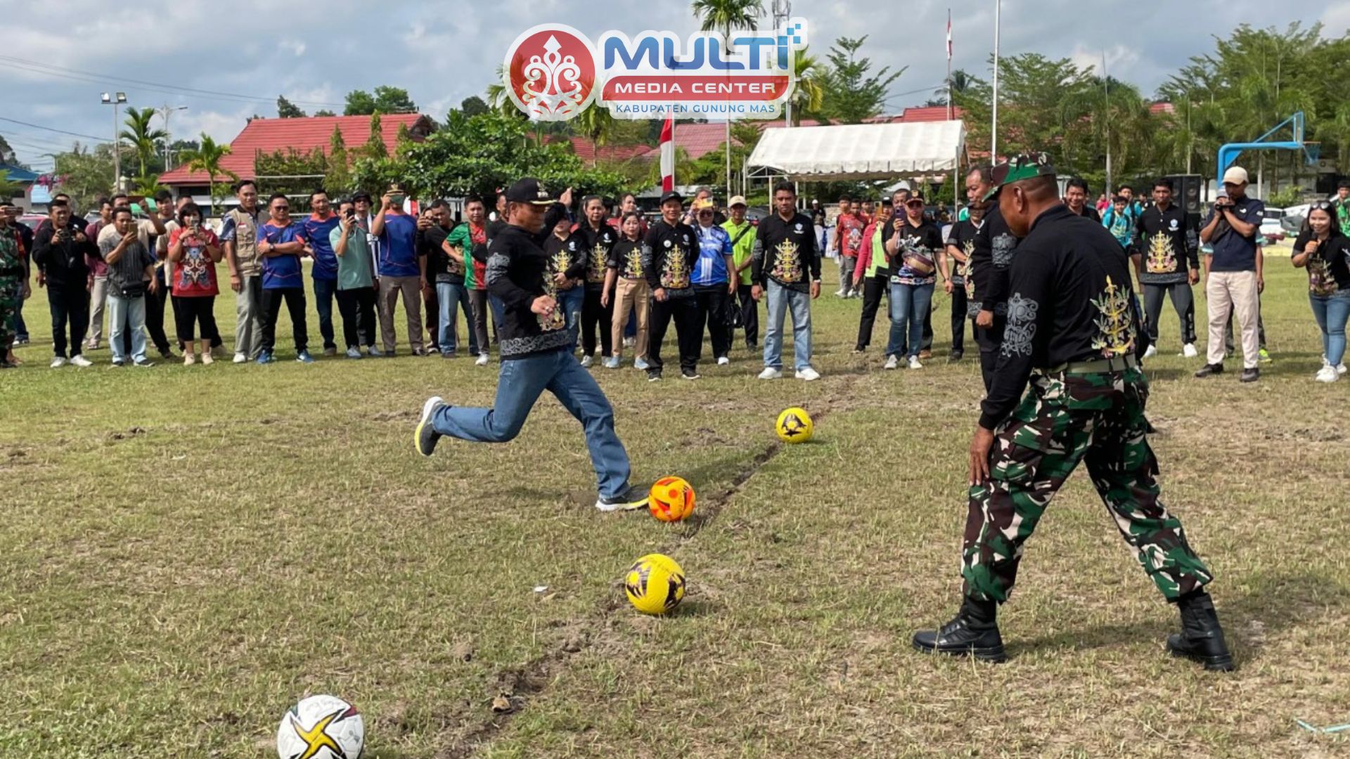Foto : Camat Kurun, Iltem, bersama Danramil Kurun Kapten Inf Sutaji, saat opening tendangan bola pertama tanda dimulainya Turnamen Sepakbola Camat Cup I Kecamatan Kurun, dilapangan Isen Mulang, Jumat (3/10/2025)
