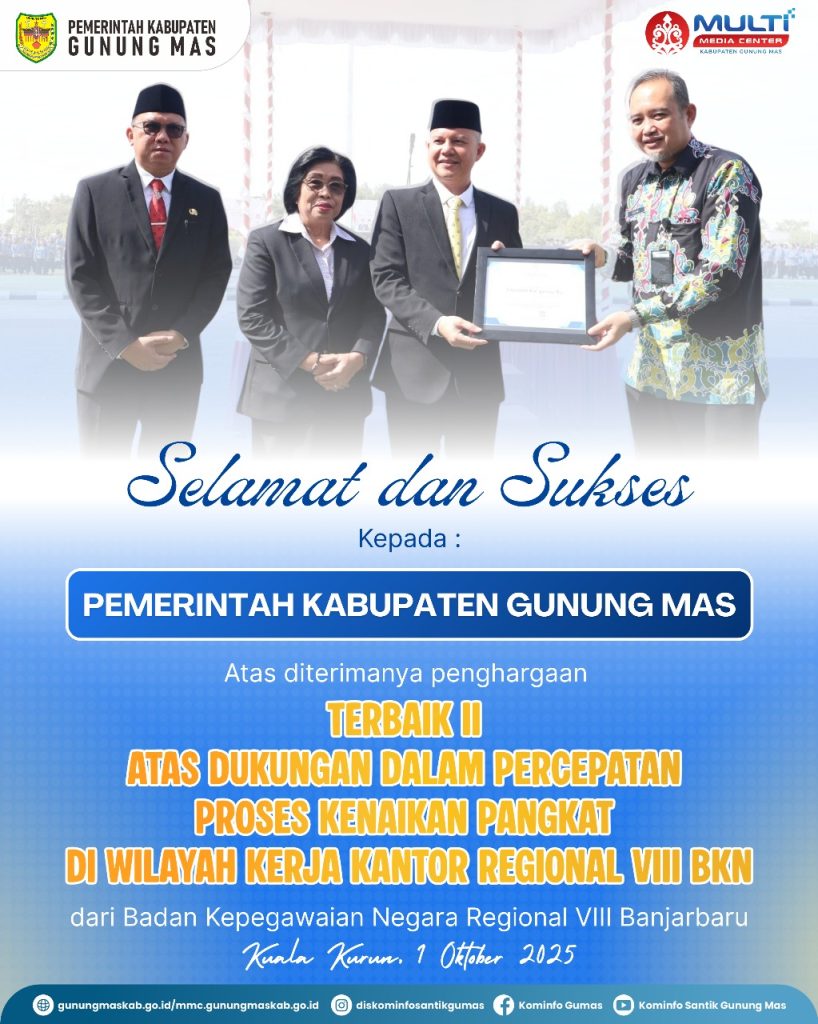 MMCGumas – Kuala Kurun – Pemerintah Kabupaten (Pemkab) Gunung Mas kembali menorehkan prestasi membanggakan di tingkat regional. Kali ini, Pemkab Gunung Mas meraih Penghargaan Terbaik II atas dukungan percepatan proses kenaikan pangkat Aparatur Sipil Negara (ASN) di wilayah kerja Kantor Regional Badan Kepegawaian Negara (BKN).
