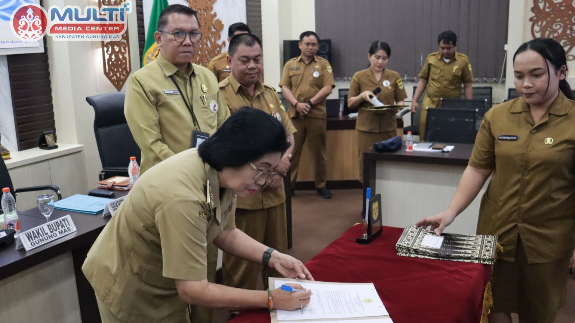 Foto : Wakil Bupati Gunung Mas, Efrensia L.P. Umbing didampingi Sekda, Richard, saat Teken Fakta Integritas bersama 11 Instansi pemberi layanan, di aula lantai I kantor Bupati, Selasa (7/10/2025)