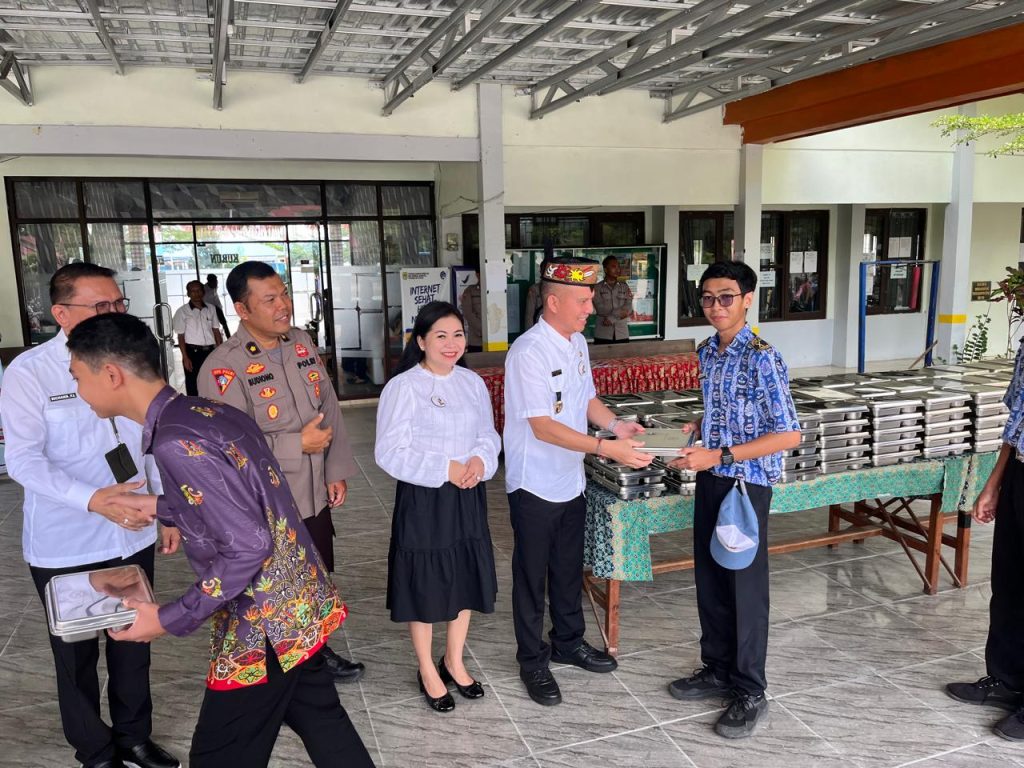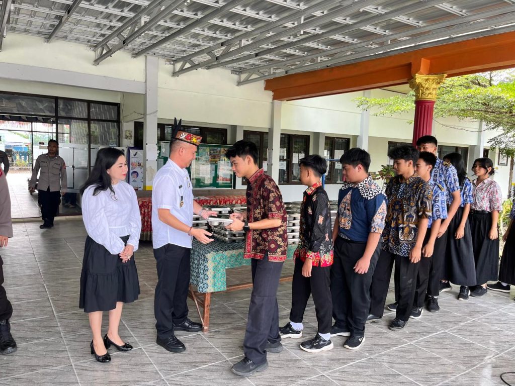 MMC Gumas – Kuala Kurun – Bupati Gunung Mas, Jaya Samaya Monong, bersama Ketua TP PKK Kabupaten Gunung Mas, Mimie Mariatie Jaya S. Monong, meninjau secara langsung pendistribusian perdana program Makan Bergizi Gratis (MBG) dari Satuan Pelayanan Pemenuhan Gizi (SPPG) Polres Gunung Mas, yang disalurkan kepada peserta didik di SMA Negeri 1 Kuala Kurun, Rabu (8/10/2025).