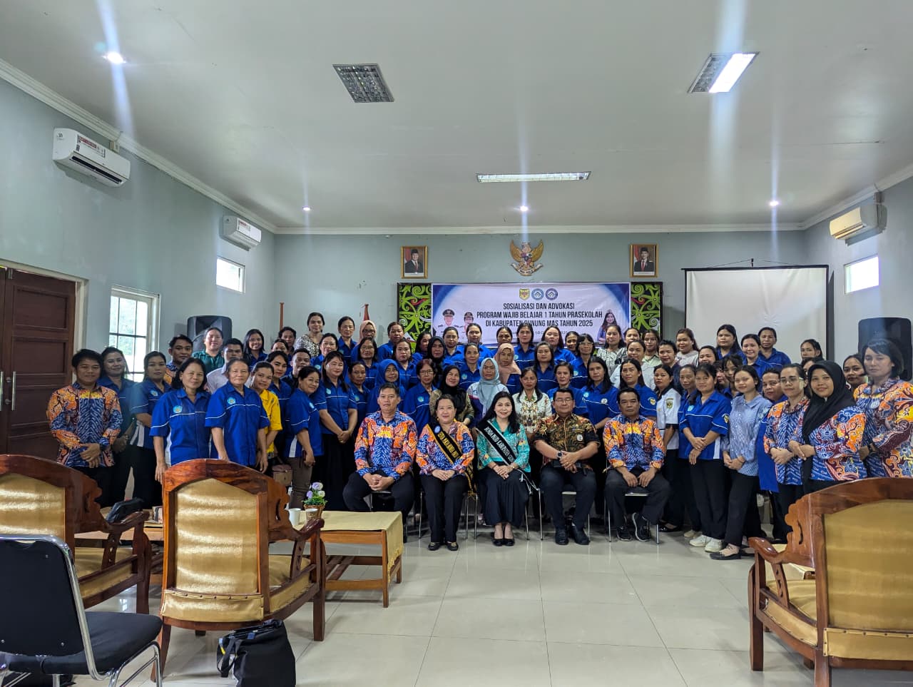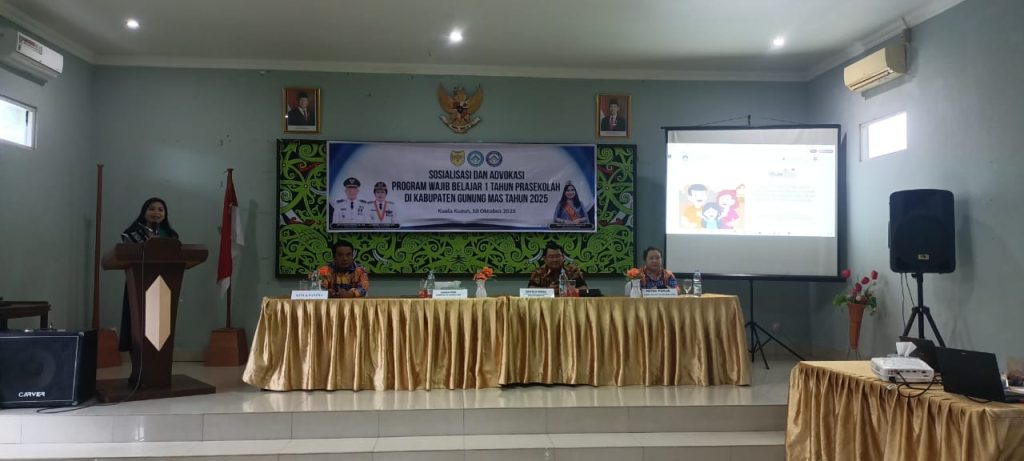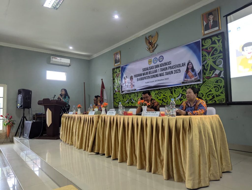 MMCGumas – Kuala Kurun – Pemerintah Kabupaten Gunung Mas melalui Pokja Bunda PAUD menggelar kegiatan Sosialisasi dan Advokasi Program Wajib Belajar Satu Tahun Pra Sekolah di Aula Hotel Zefanya Kuala Kurun, Jumat (10/10/2025). Kegiatan ini diikuti oleh 65 guru Pendidikan Anak Usia Dini (PAUD) dari seluruh kecamatan di Kabupaten Gunung Mas.