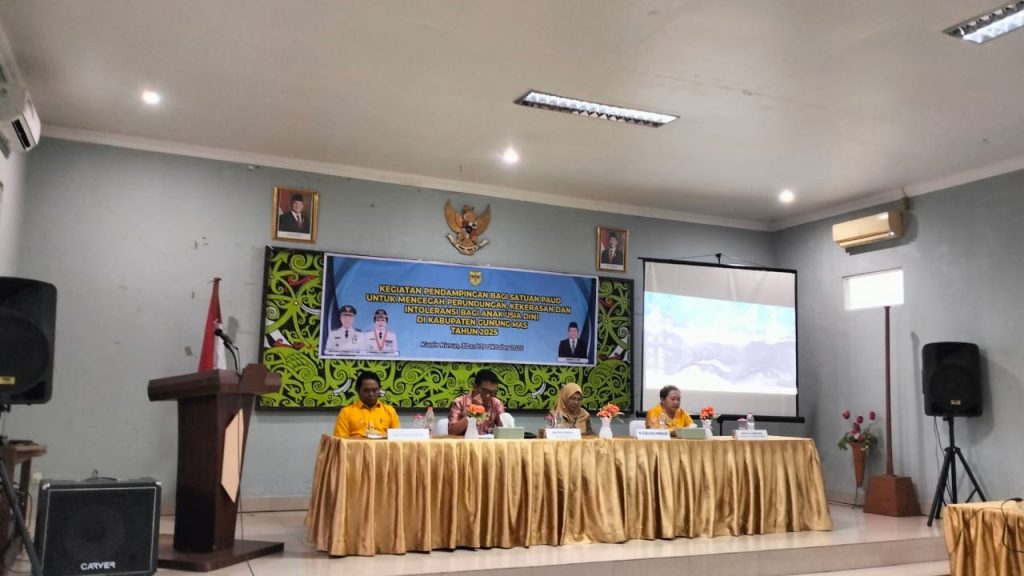 MMCGumas – Kuala Kurun – Pemerintah Kabupaten Gunung Mas melalui Dinas Pendidikan, Kepemudaan, dan Olahraga (Disdikpora) menggelar kegiatan Pendampingan bagi Satuan PAUD untuk Mencegah Perundungan, Kekerasan, dan Intoleransi bagi Anak Usia Dini Tahun 2025, bertempat di Aula Hotel Zefanya Kuala Kurun, Jumat (31/10/2025).