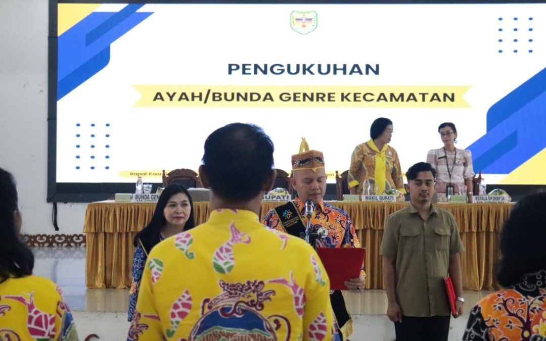 Pengukuhan Ayah dan Bunda GenRe Kecamatan ditandai dengan pemasangan selempang secara simbolis oleh Bupati Jaya Samaya Monong, yang didampingi oleh Ketua TP PKK Kabupaten Gunung Mas, Mimie Mariatie Jaya S. Monong.