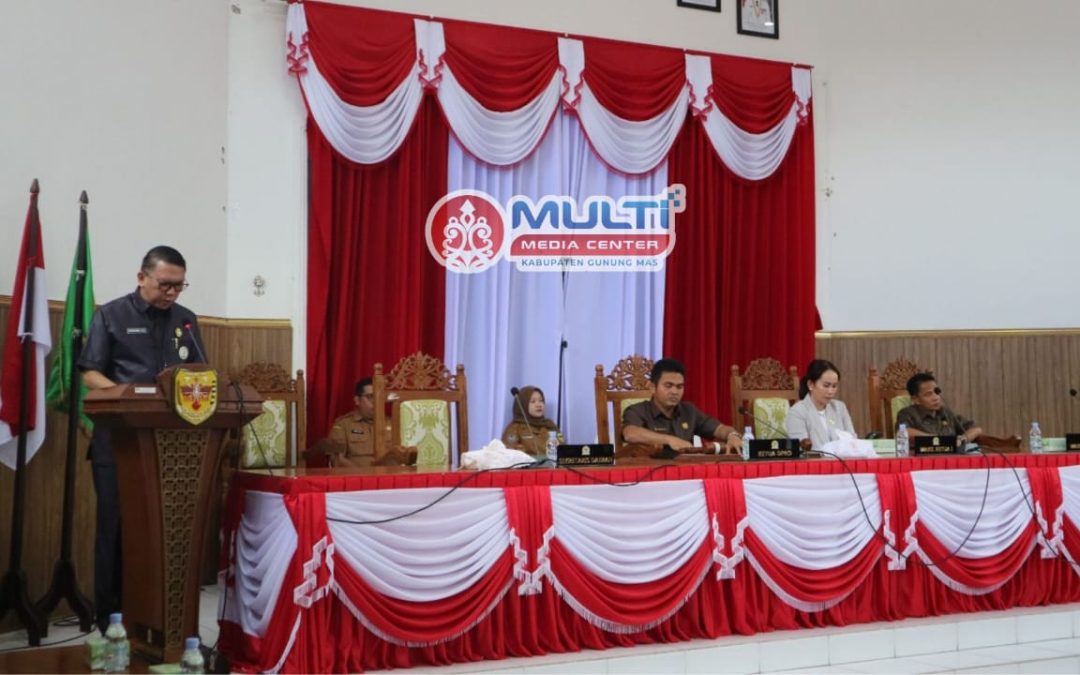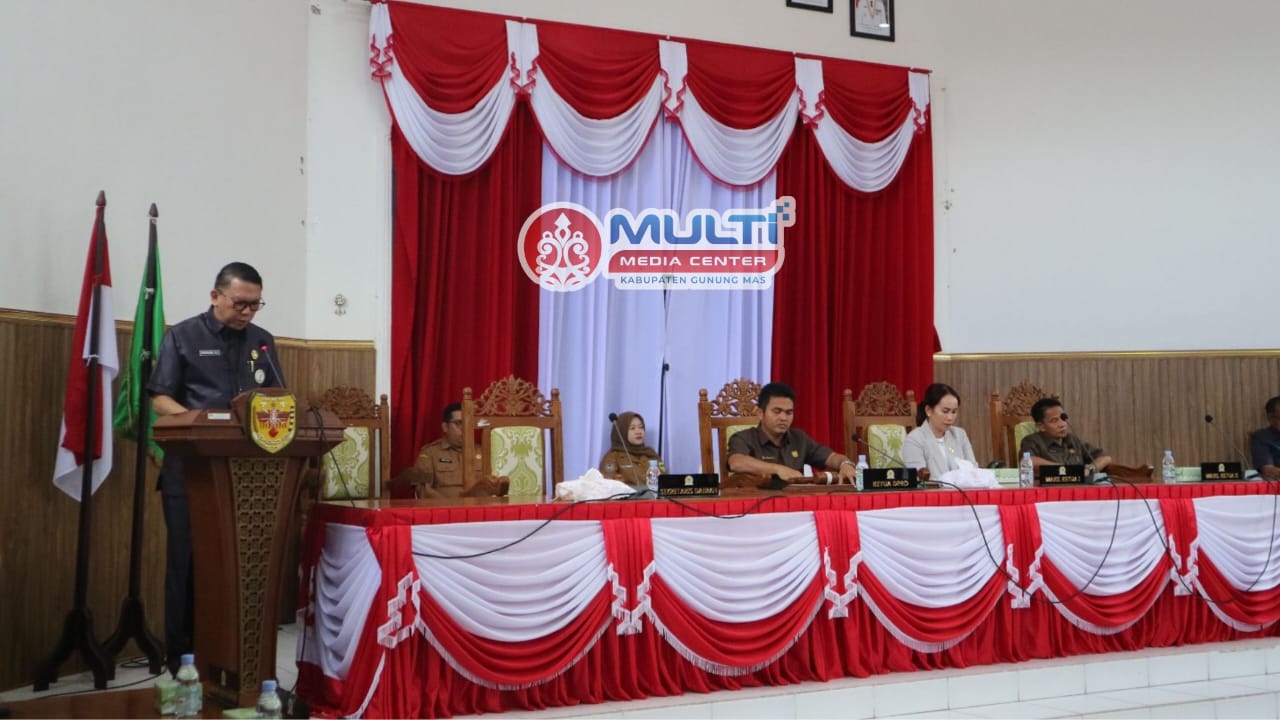 MMCGumas – Kuala Kurun – Sekretaris Daerah Kabupaten Gunung Mas, Richard, mewakili Bupati Jaya S. Monong menyampaikan Jawaban Pemerintah Daerah atas Pandangan Umum Fraksi-Fraksi DPRD terhadap Rancangan Peraturan Daerah (Raperda) tentang Anggaran Pendapatan dan Belanja Daerah (APBD) Tahun Anggaran 2026. Penyampaian tersebut dilakukan pada Rapat Paripurna ke-8 Masa Persidangan I Tahun Sidang 2025, Selasa (18/11/2025).