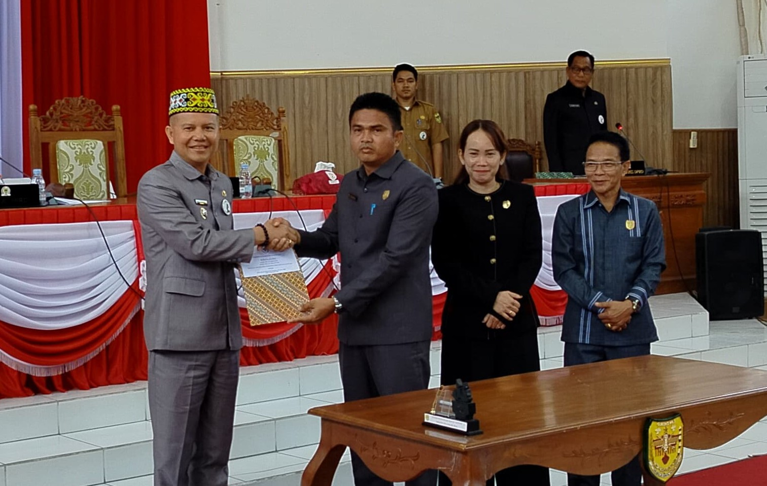 Foto : Bupati Gunung Mas Jaya S. Monong, bersama Ketua DPRD, Binartha, dan Anggota Dewan Lainnya, saat menyetujui Raperda APBD di ruang sidang paripurna, Senin 24/11/2025