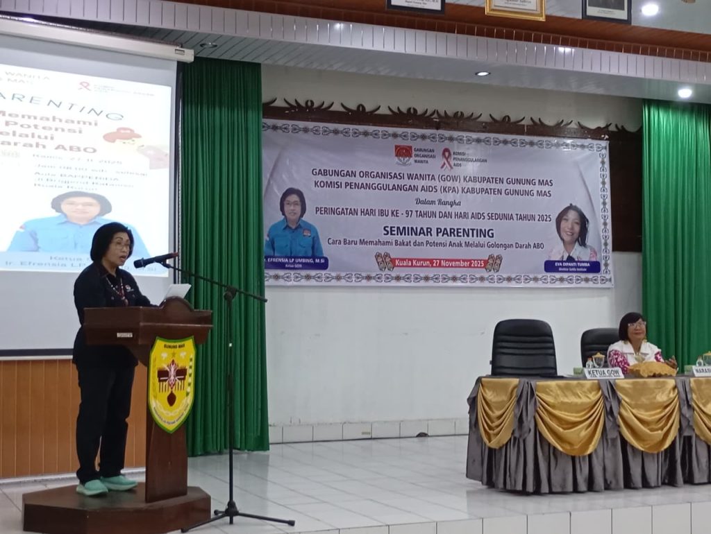 MMCGumas – Kuala Kurun – Dalam rangka memperingati Hari Ibu ke-97 dan Hari AIDS Sedunia 2025, Gabungan Organisasi Wanita (GOW) Kabupaten Gunung Mas bekerja sama dengan Komisi Penanggulangan AIDS (KPA) menggelar seminar parenting bertema “Cara Baru Memahami Bakat dan Potensi Anak Melalui Golongan Darah ABO.”
