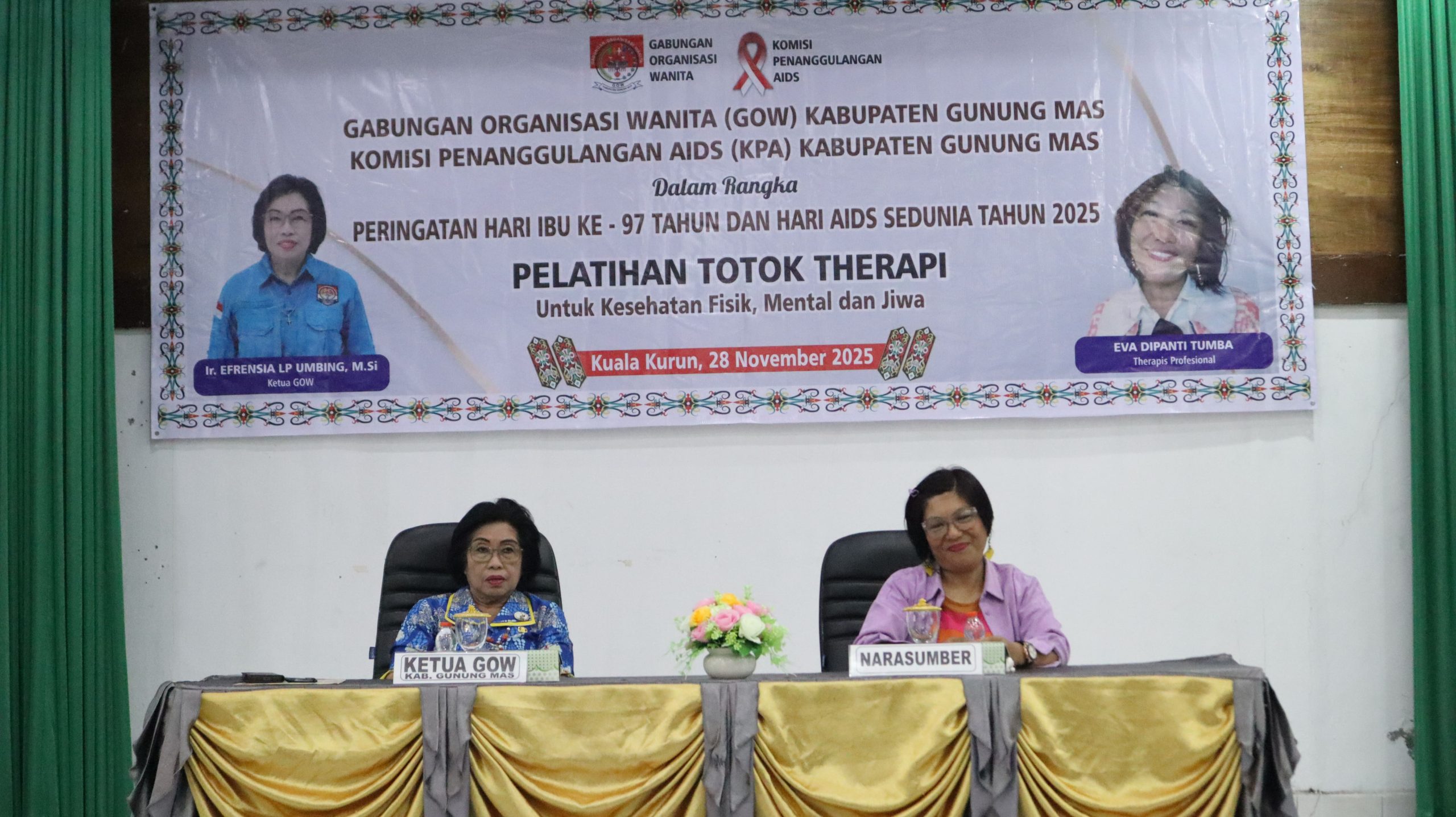 Dalam sambutannya, Efrensia menyampaikan bahwa pelatihan Totok Terapi ini merupakan rangkaian Peringatan Hari Ibu ke-97 dan Hari AIDS Sedunia Tahun 2025, hasil kerja sama GOW dan Komisi Penanggulangan AIDS (KPA) Kabupaten Gunung Mas.