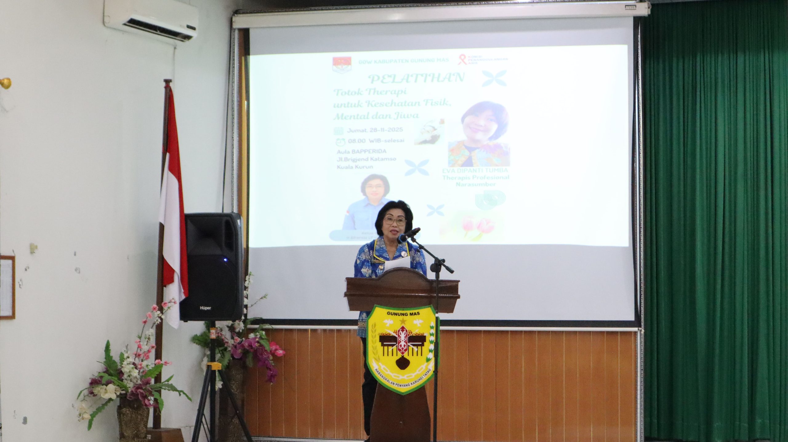 MMCGumas – Kuala Kurun – Wakil Bupati Gunung Mas, Efrensia L.P. Umbing, selaku Ketua Gabungan Organisasi Wanita (GOW) Kabupaten Gunung Mas, secara resmi membuka kegiatan Pelatihan Totok Terapi untuk Kesehatan Fisik, Mental, dan Jiwa di Kabupaten Gunung Mas. Kegiatan ini berlangsung di Aula BAPPERIDA Kabupaten Gunung Mas, Jumat (28/11/2025).
