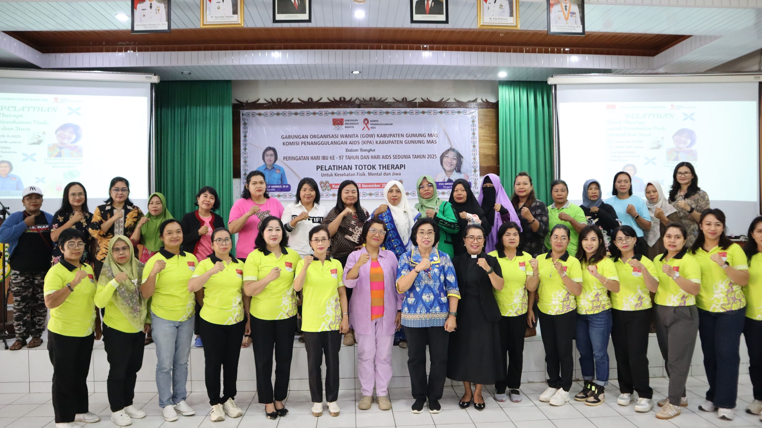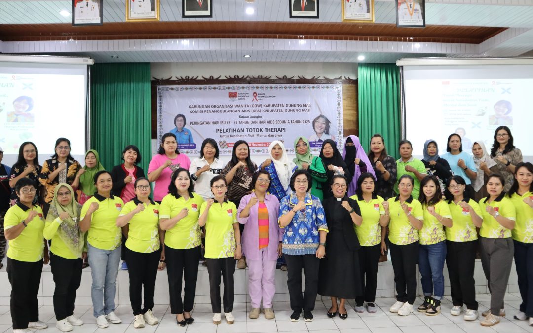 Dalam sambutannya, Efrensia menyampaikan bahwa pelatihan Totok Terapi ini merupakan rangkaian Peringatan Hari Ibu ke-97 dan Hari AIDS Sedunia Tahun 2025, hasil kerja sama GOW dan Komisi Penanggulangan AIDS (KPA) Kabupaten Gunung Mas.