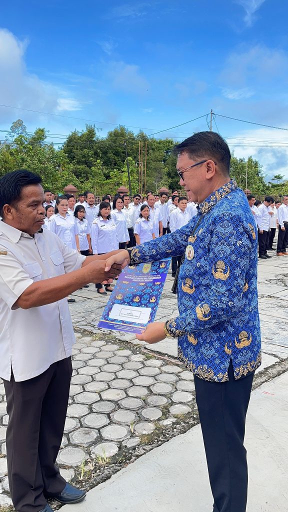 Foto : Sekda Gunung Mas, Richard saat menyerahkan SK secara simbolis kepada salah satu PPPK Paruh waktu, di halaman Kantor BKPSDM Kabupaten Gunung Mas, Rabu (17/12/2025).
