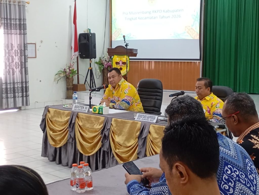 MMCGumas – Kuala Kurun – Asisten Bidang Administrasi Umum Sekretariat Daerah Kabupaten Gunung Mas, Edison, secara resmi membuka kegiatan Pra Musrenbang Tingkat Kecamatan Tahun 2026 yang dilaksanakan di Aula Kantor Bapperida Kabupaten Gunung Mas, Selasa (29/1/2026).