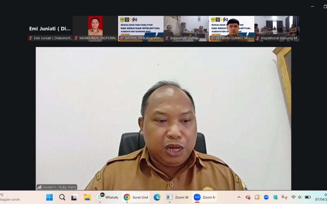MMCGumas – Kuala Kurun – Pemerintah Kabupaten Gunung Mas melalui Badan Perencanaan Pembangunan, Riset dan Inovasi Daerah (Bapperida) menggelar kegiatan Sosialisasi dan Fasilitasi Hak Kekayaan Intelektual (HKI) Tahun 2026 secara daring melalui Zoom Meeting, Selasa (7/4/2026).