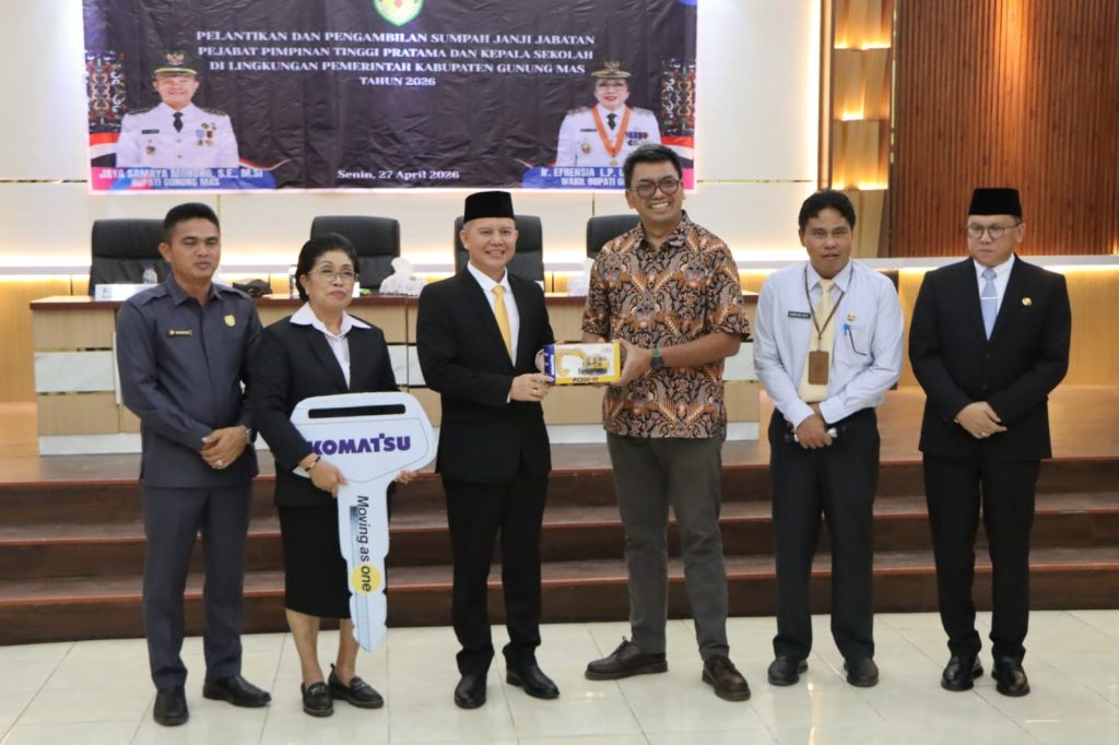 MMCGumas – Kuala Kurun – Bupati Gunung Mas, Jaya Samaya Monong, secara resmi menerima kedatangan 1 set unit alat berat hasil pengadaan Dinas Pekerjaan Umum (PU) Kabupaten Gunung Mas. Penyerahan dilakukan langsung oleh pihak United Tractors di Aula Dinas PU Gunung Mas, Senin (27/4/2026).